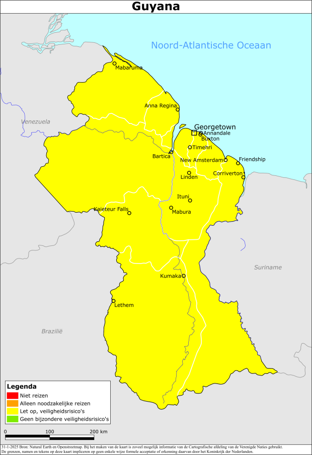 - De kleurcode van het reisadvies voor Guyana is geel. U kunt erheen reizen. Maar let op: er zijn bijzondere veiligheidsrisico’s.