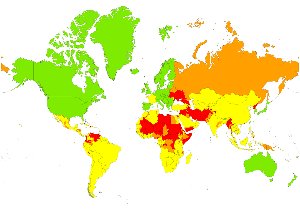 Bekijk op de wereldkaart welke landen en gebieden kleurcode groen, geel, oranje of rood hebben in het reisadvies.